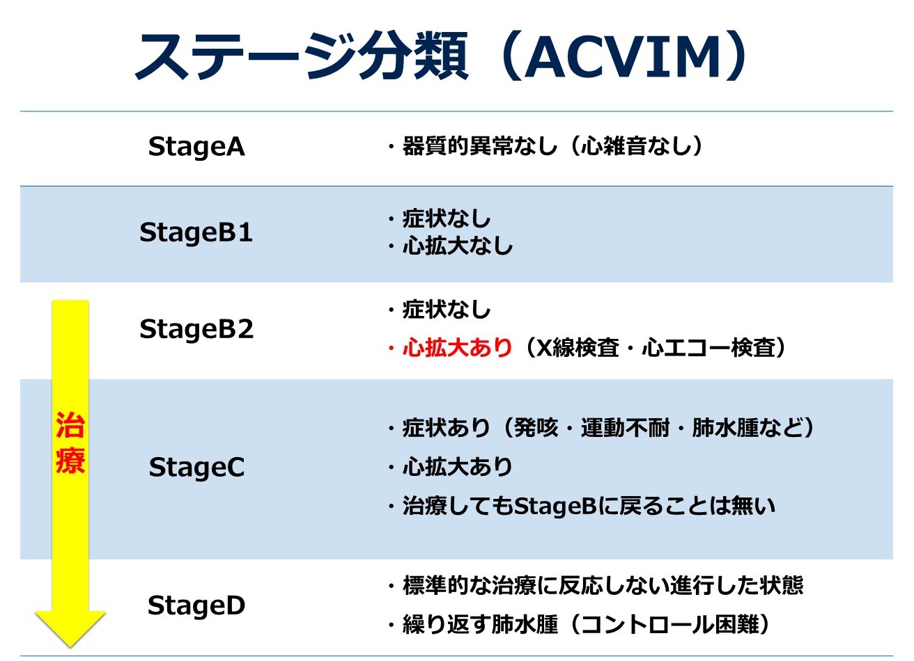 これらの情報を組み合わせて、病気のステージ(ACVIM分類)を判断し、治療が必要かどうかを決めます。